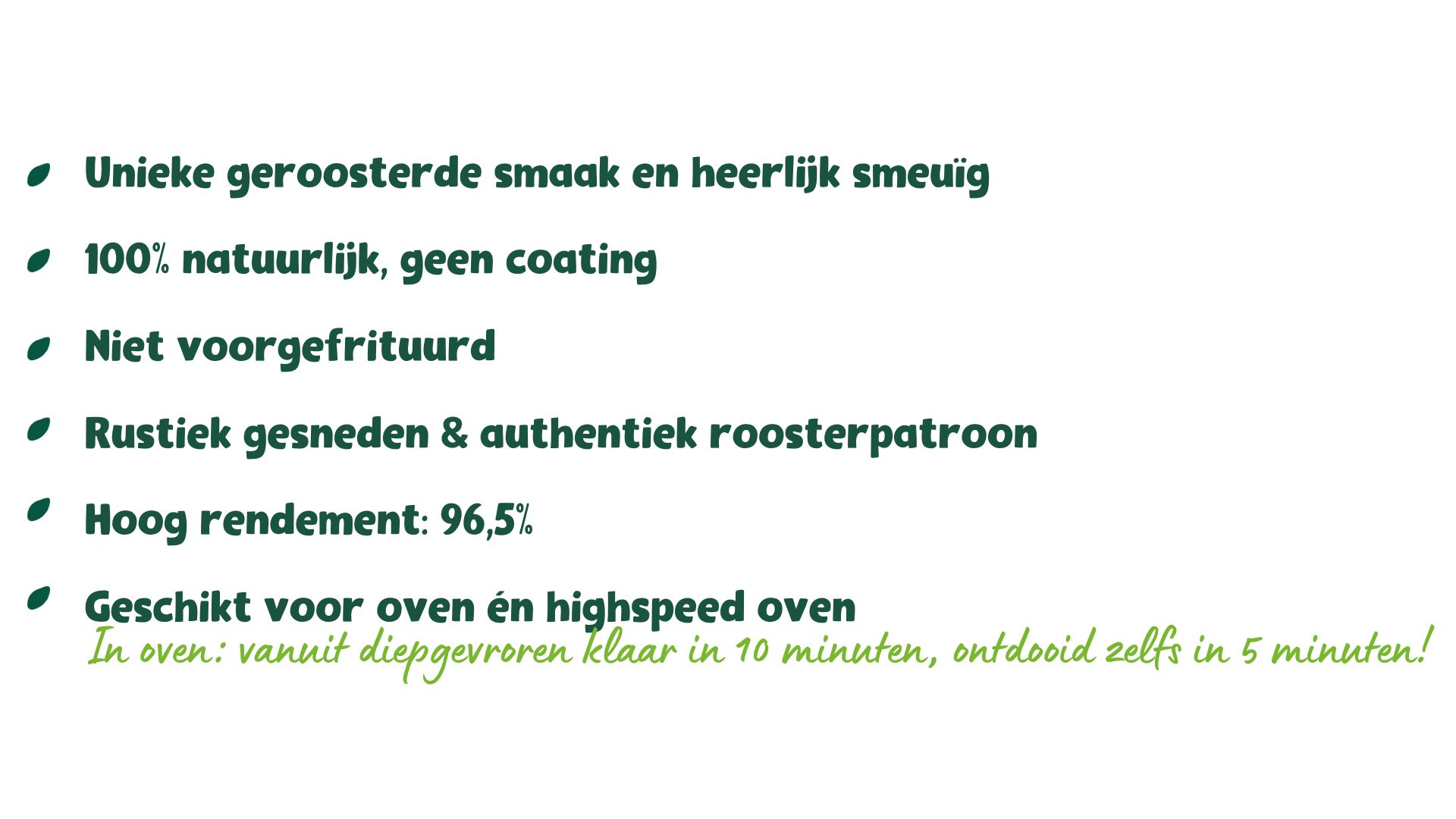 Een lust voor het oog met hun authentieke roosterpatroon en ambachtelijke snit. Recht uit de diepvries in slechts 10 minuten klaar, of zelfs in 5 minuten als ze reeds ontdooid zijn.